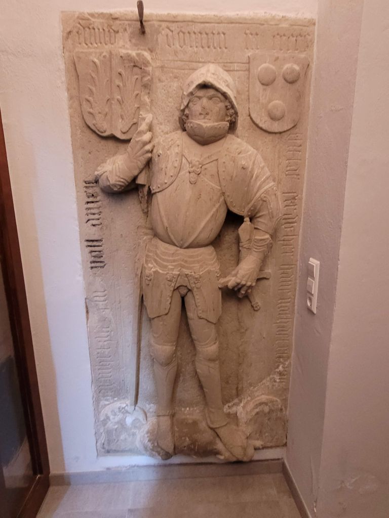 Gleich hinter der Eingangstür der Hochberger Schlosskirche findet sich rechts die Grabplatte des Ritters Hans VI. Nothaft, gestorben 1507. Es handelt sich um die älteste der sieben Grabplatten der Nothaft, die im 19. Jh. in den Neubau der Schlosskirche übernommen wurden. Hans VI. gehörte zum Beihinger Zweig (heute Freiberg a.N.) der Familie Nothaft nach einer Erbteilung des Besitzes der Nothaft zu Hochberg 1445. Er wurde aber in Hochberg bestattet. Hans VI. diente als Rat dem Grafen Eberhard im Bart von Württemberg und zog mit diesem als einer seiner 24 adligen Begleiter 1468 ins Heilige Land. In der Grabeskirche zu Jerusalem ließ er sich wie Eberhard zum Ritter schlagen. Eberhards Lehrer, Berater und erster Biograph, der Humanist Johannes Nauclerus (1425-1510) interpretiert diese Pilgerreise als Bußgang Eberhards: „Er wandelte sich dermaßen gründlich zu einem anderen Mann, dass er die früheren Vergnügungen und Unmäßigkeiten unschwer aufwog durch Maß und Lebensernst.“ Später wurde erzählt, dass Eberhards Entscheidung, sich nicht mehr zu rasieren, was zum Beinamen „Eberhard im Bart“ führte, auch eine Bußentscheidung dieser Pilgerfahrt gewesen sei. In den Statuten der „Ritter vom Heiligen Grab“ ist festgehalten, dass sie „Ungläubige aus den Ländern der Christen hinauszutreiben“ haben. Auch das setzte Eberhard mit Verve um: 2022 gab es eine große Diskussion um den Namen der Landesuniversität Tübingen (Eberhard-Karls-Universität), weil Eberhard die Gründung der Universität 1477 nur unter der Auflage genehmigte, dass sich keine Juden in Tübingen niederließen. 1492 verfügte er in seinem Testament, dass mit seinem Tod alle Juden aus Württemberg vertrieben werden sollten. Bis 1806 hatten Juden daraufhin über 300 Jahre Aufenthaltsverbot in Württemberg. 2022 wurde diskutiert, ob der Antisemitismus Eberhards dem damaligen Zeitgeist entsprach oder auch für einen Fürsten des 15. Jh. sehr ausgeprägt war. Die Motivation durch die außergewöhnliche Pilgerfahrt spricht für Letzteres. Wie sich Hans VI. Nothaft zu all dem verhielt, wissen wir nicht. Er konnte sich zu seinen Lebzeiten aber sicher nicht vorstellen, dass die Ausweisungsentscheidung Eberhards einst die wirtschaftliche Grundlage der reichsritterschaftlichen Herrschaft Hochberg retten würde, die 1687 von den Nothafts durch Erbfall an die von Gemmingen überging: 1757 genehmigte der Hochberger Ortsherr Weidprecht von Gemmingen, dass sich der Jude Abraham Gideon mit seiner Familie in Hochberg niederlassen kann. Viele jüdische Familien folgten und die Hochberger jüdische Gemeinde entstand. Das Ganze war eine Win-Win-Situation: Die Hochberger Ortsherren erhielten hohe Schutzgelder von den Juden, die Hochberger Juden konnten tagsüber zum Geschäftemachen ins württembergische Gebiet ausschwärmen. Hochberg war eine ideale Basis zum Handeltreiben im sonst verbotenen württembergischen Kernland. Hans VI. Nothaft konnte sich eine solche Wendung als Gefolgsmann Eberhards zu seinen Lebzeiten sicher nicht vorstellen.