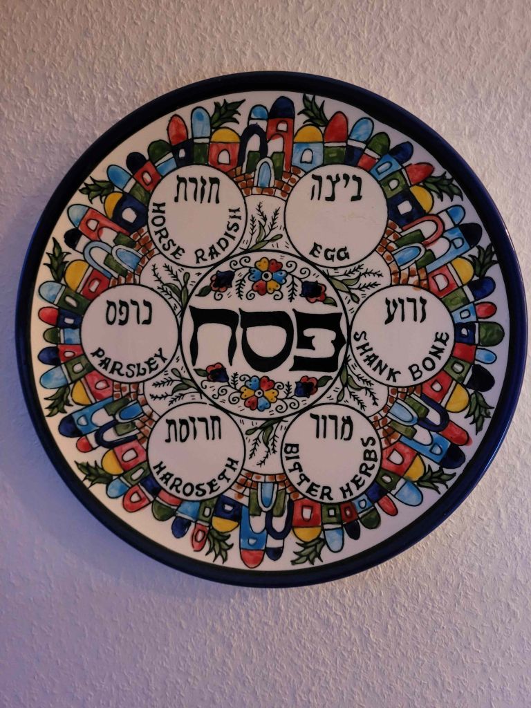 Foto: Sederteller mit Platzhaltern für die symbolischen Lebensmittel des Sedermahls